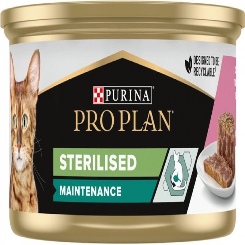 Упаковка вологого корму для дорослих кастрованих котів Pro Plan Sterilised, шматочки у паштеті, з ту