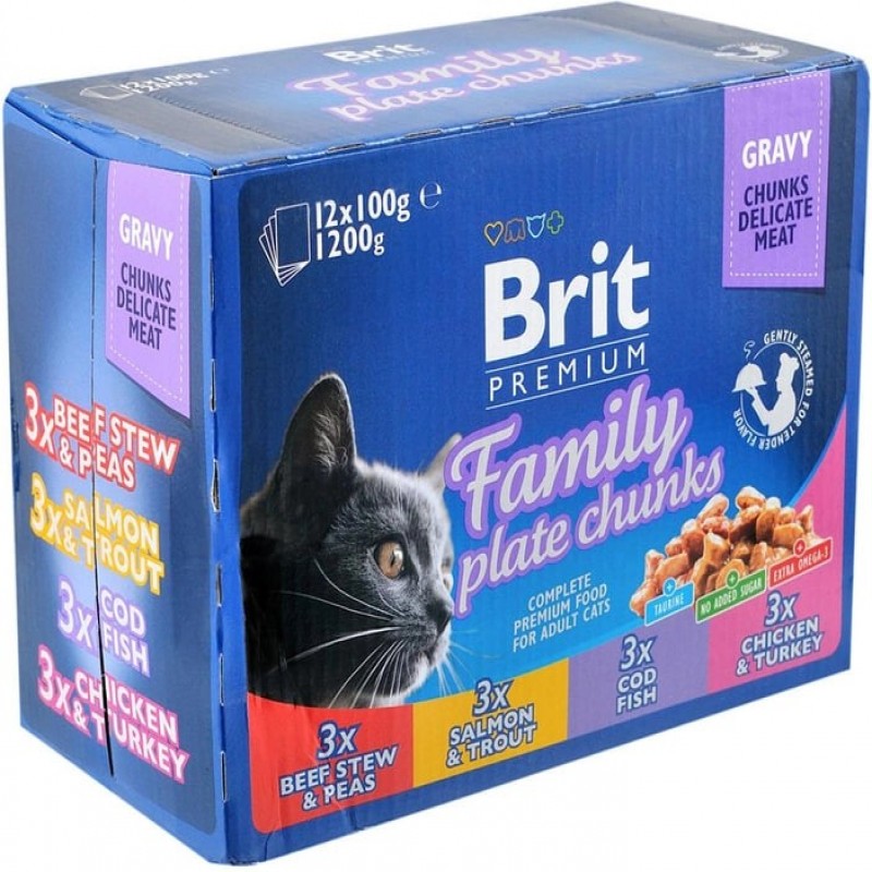 Упаковка вологого корму для кішок Brit Premium сімейна тарілка асорті 4 смаку 100 г х 12 шт (8595602