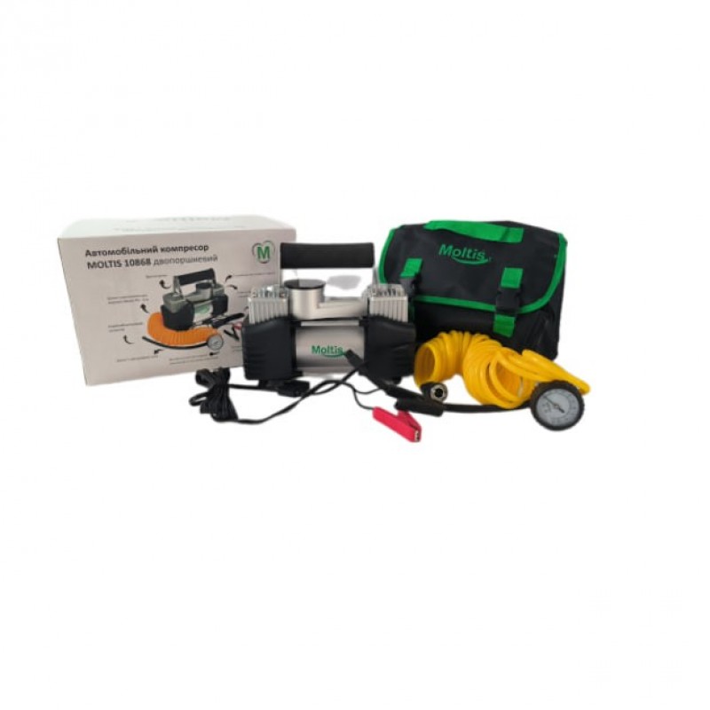 Компрессор автомобильный Moltis 10868 - это классический двух-поршневой компрессор повышенной мощности, который питается от клемм АКБ, что дает возможность ему накачать шины, лодки и любой спортивный инвентарь в два раза быстрей, чем любому другому авто-компрессору.Компрессор выглядит весьма стильно и интересно. Видно качественную сборку, продуманность деталей, что позволяет смело нам заявлять о высоком качестве данного бренда. Компрессор обладает спиральным шлангом длиной 5.7 м, что позволяет вам без проблем дотянутся до любого колеса вашего автомобиля. Так же в комплекте вас ждет набор необходимых переходников для накачки шин и спортивного инвентаря и водонепроницаемую сумку для хранения и транспортировки компрессора. Компрессор Moltis 10868 сделан полностью из металла. Оборудован металлической ручкой с мягким покрытием, а корпус усилен металлическим каркасом. Что же касается основания компрессора, то тут так же все продуманно до мелочей. Четыре амортизирующие опоры понизят уровень шума и сведут вибрацию на нет. Его сетевой кабель состоит из 100% меди, так же вы найдете встроенный предохранитель на 30А. Зажимы компрессора сделаны из высококачественного материала, что гарантирует вам надежную фиксацию на клеммы АКБ. Внимание!!! Гарантия действует при наличии заводской упаковки, инструкции.